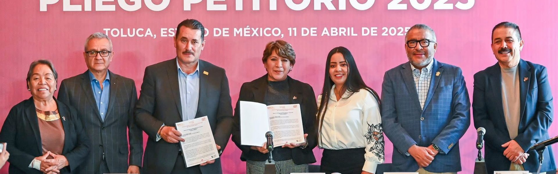 Toluca, Estado de México, 11 de abril de 2025.- Esta tarde, el Prof. José Alfredo Geraldo Benoit, Secretario General de la Sección 17 del Sindicato Nacional de Trabajadores de la Educación (SNTE), entregó formalmente el Pliego Petitorio 2025 a la Gobernadora del Estado de México, Mtra. Delfina Gómez Álvarez, en representación de las demandas del magisterio del Valle de Toluca.