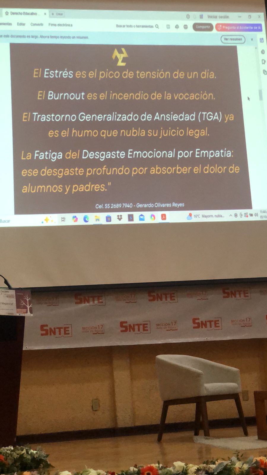 El Mtro. Gerardo Olivares Reyes, especialista en derecho educativo y psicología, abordó con profundidad el tema de la seguridad jurídica magisterial, explicando cómo el marco legal puede convertirse en un escudo protector del trabajo docente. Con un estilo cercano y participativo, invitó a las y los asistentes a reflexionar sobre la importancia de conocer las normas que regulan su labor y a fortalecer tanto su bienestar emocional como su formación jurídica.