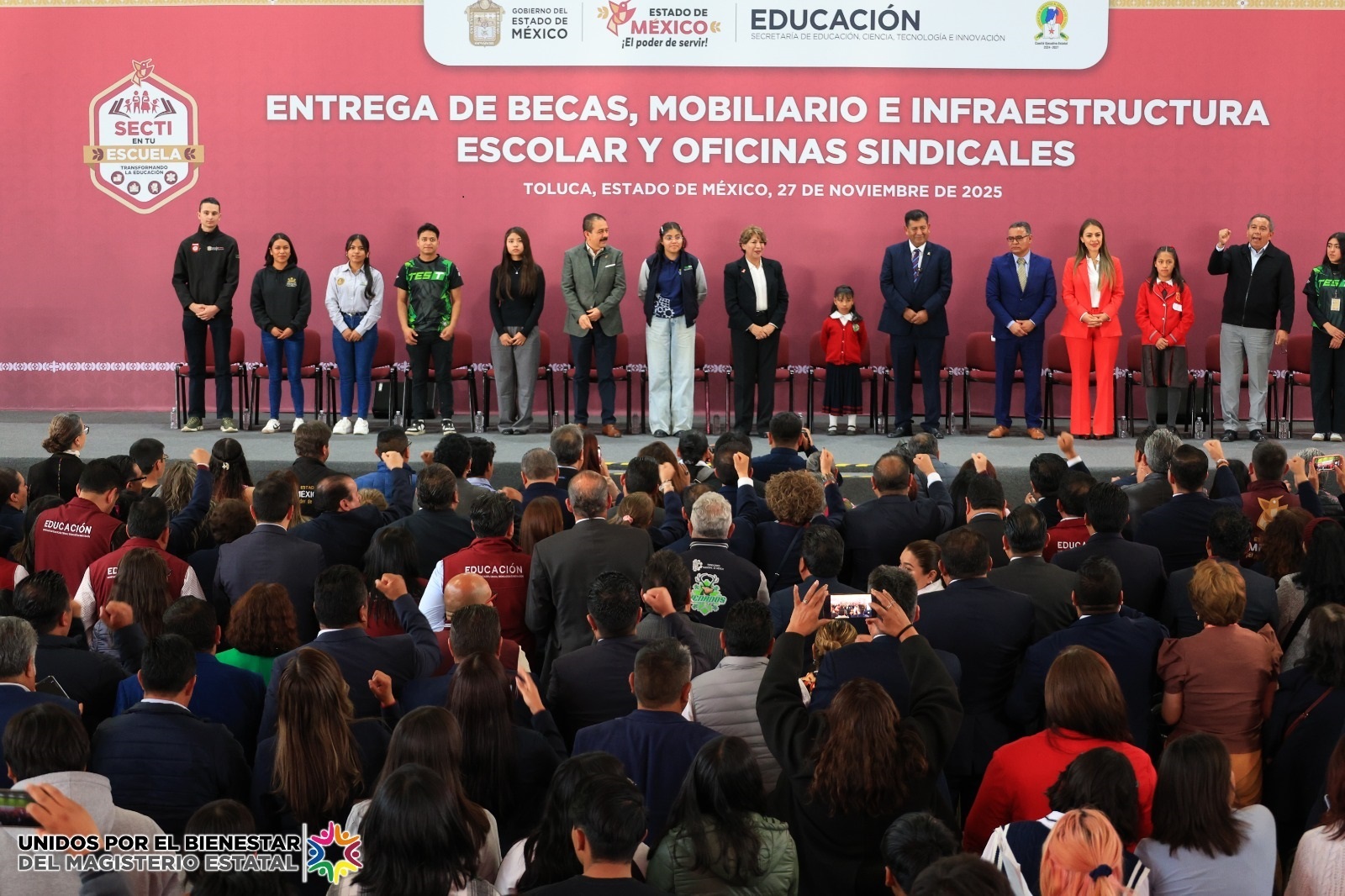 Toluca, Estado de México, 28 de noviembre de 2025. La gobernadora Delfina Gómez Álvarez inauguró el Edificio de la Unidad Sindical del Sindicato de Maestros al Servicio del Estado de México (SMSEM), acompañada por el Secretario General, Jenaro Martínez Reyes. Tras el recorrido y la develación de placas, la mandataria encabezó en el Auditorio “Prof. Agripín García Estrada” la entrega de becas de la Olimpiada del Conocimiento, apoyos para estudiantes de educación superior, así como vales de obra y mobiliario escolar.